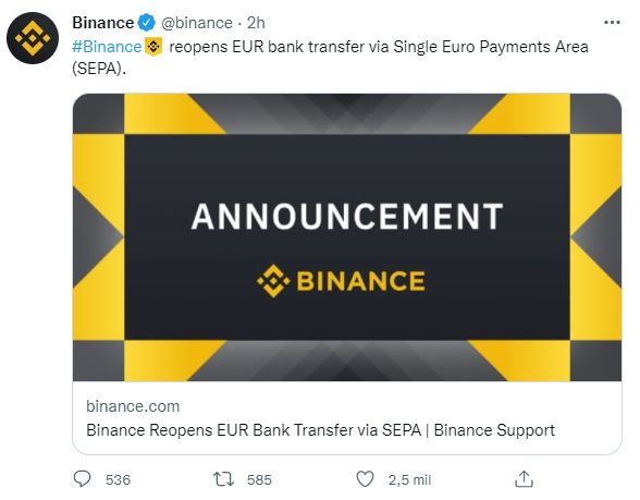 De acuerdo al anuncio realizado por Binance, los pagos a través de SEPA se reactivarán desde este miércoles 26 de enero a la 1 pm UTC, comenzando con una prueba piloto en donde una serie de usuarios “escogidos en base a una serie de criterios” serán los primeros en volver a utilizar este mecanismo