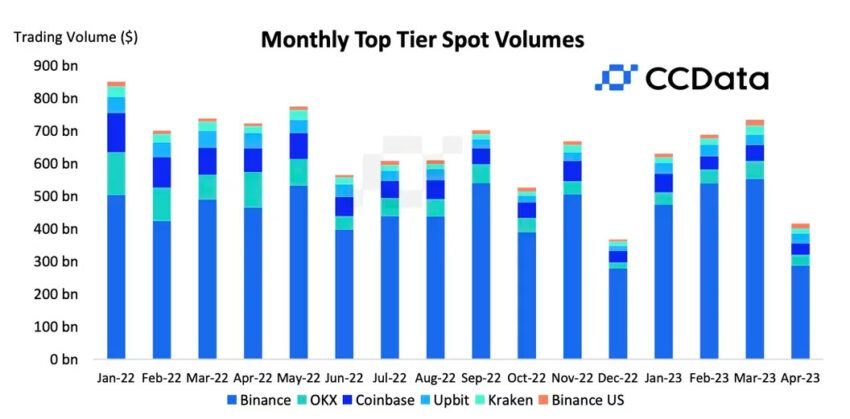 A principios de este mes, CCData informó que el volumen de transacciones en Binance experimentó una disminución mensual consecutiva en abril, cayendo 48% debido a la disminución de los niveles de transacciones en toda la industria.