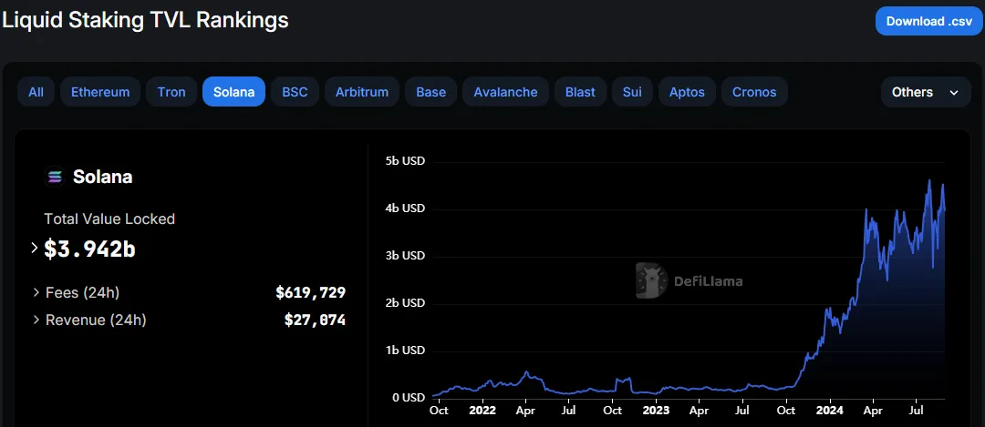 Según datos de DefiLlama, el liquid staking de Solana ha más que duplicado su valor total bloqueado (TVL) en 2024, aumentando de 1.9 mil millones de dólares a 3.94 mil millones de dólares. Desde su inicio en 2021, el sector ha experimentado un crecimiento impresionante, atrayendo a un gran número de participantes.