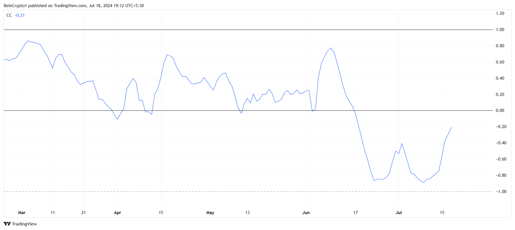 Una gran razón por la que el ascenso del token nativo de Binance se quedó corto y se detuvo por debajo del 20% es su correlación con Bitcoin. Actualmente, la correlación de BNB con Bitcoin es negativa -0.21.