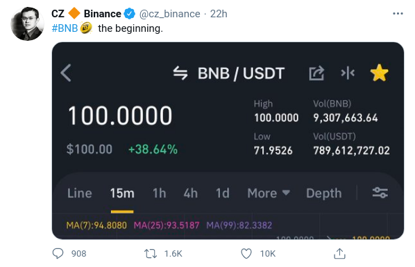 BNB supera el nivel de 100 dólares a la vez que Binance de Changpeng Zhao (CZ) añade nuevos productos y servicios a su oferta de su exchange.