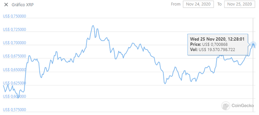 La moneda también parece reflejar el anuncio de la Binance. Minutos después de la confirmación, la moneda de Ripple ha vuelto a subir al nivel de 0,70 dólares. Hasta ahora, los activos han acumulado un máximo del 12,5% en las últimas 24 horas.