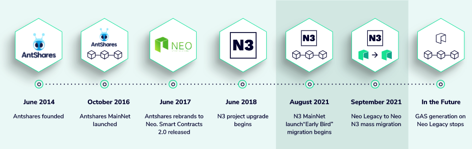 La blockchain de Neo que ejecuta N3 coexistirá con la actual blockchain de Neo Legacy durante un largo periodo de tiempo. Esto proporcionará a los usuarios una amplia oportunidad para migrar sus tokens y aplicaciones a la nueva blockchain.