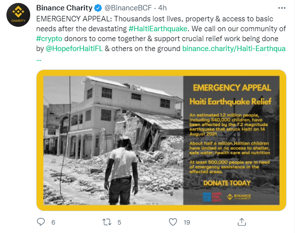 Binance enfatiza que el terremoto que azotó Haití ocurrió en medio de otros disturbios que afectan al país centroamericano. La catástrofe natural Tuvo lugar en medio de disturbios políticos y durante la pandemia del COVID-19, lo que dificulta las cosas para los equipos de ayuda.
