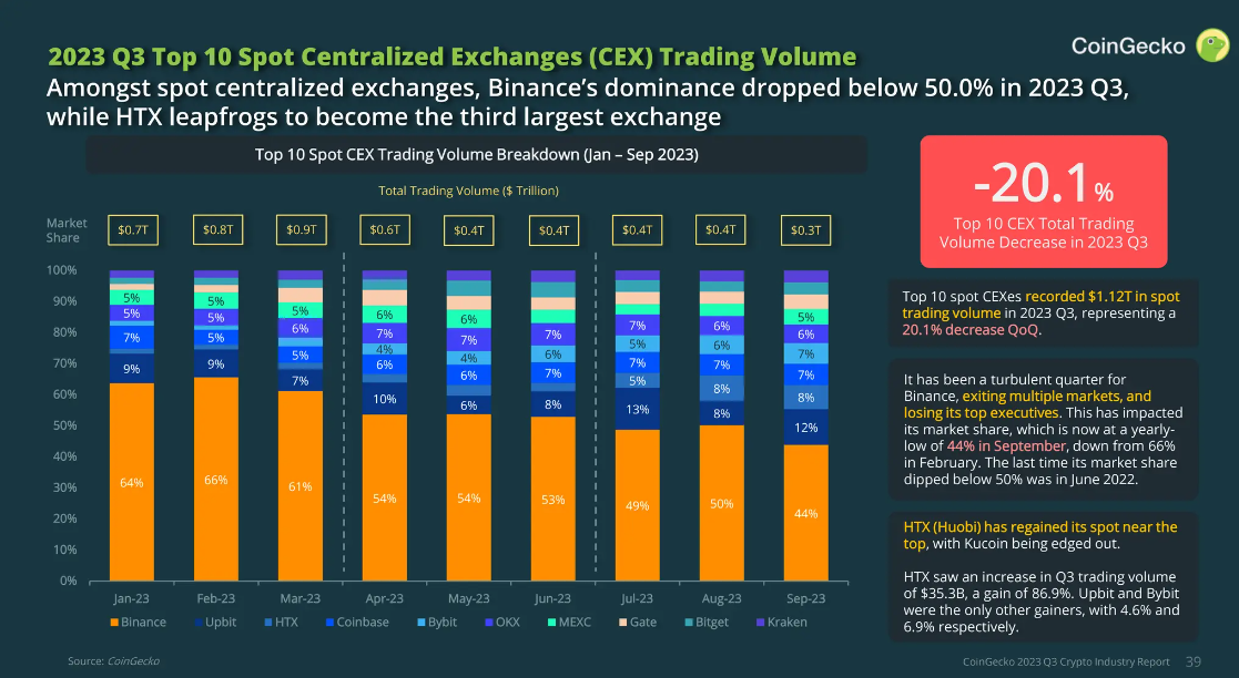 Binance también ha sido tendencia durante las últimas horas debido a datos interesantes. De acuerdo a un reciente informe trimestral de CoinGecko, el dominio del exchange en el mercado cripto cayó al 44% en septiembre.