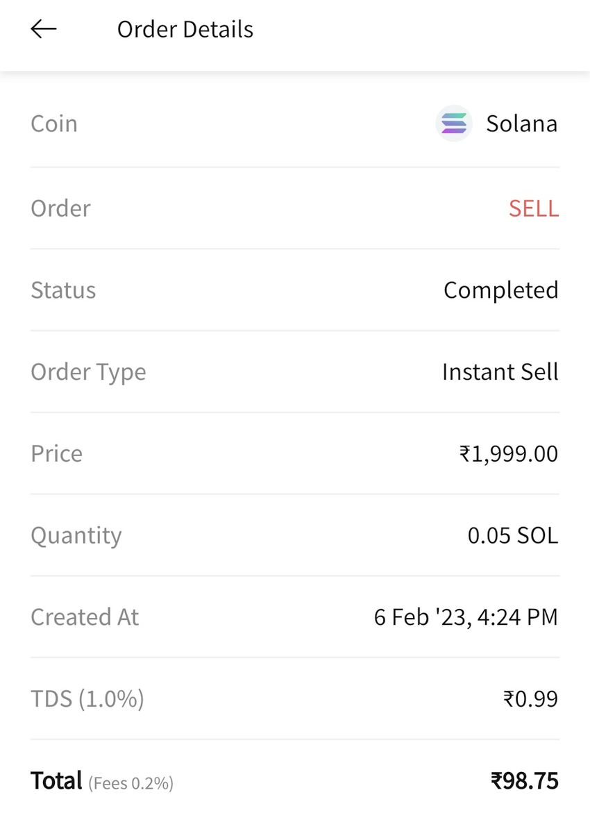 Por ejemplo, si un usuario vende criptomonedas por valor de 100 INR, solo obtendrá 98,75 INR tras deducir el TDS y las tarifas de intercambio, como se muestra en la captura de pantalla a continuación.