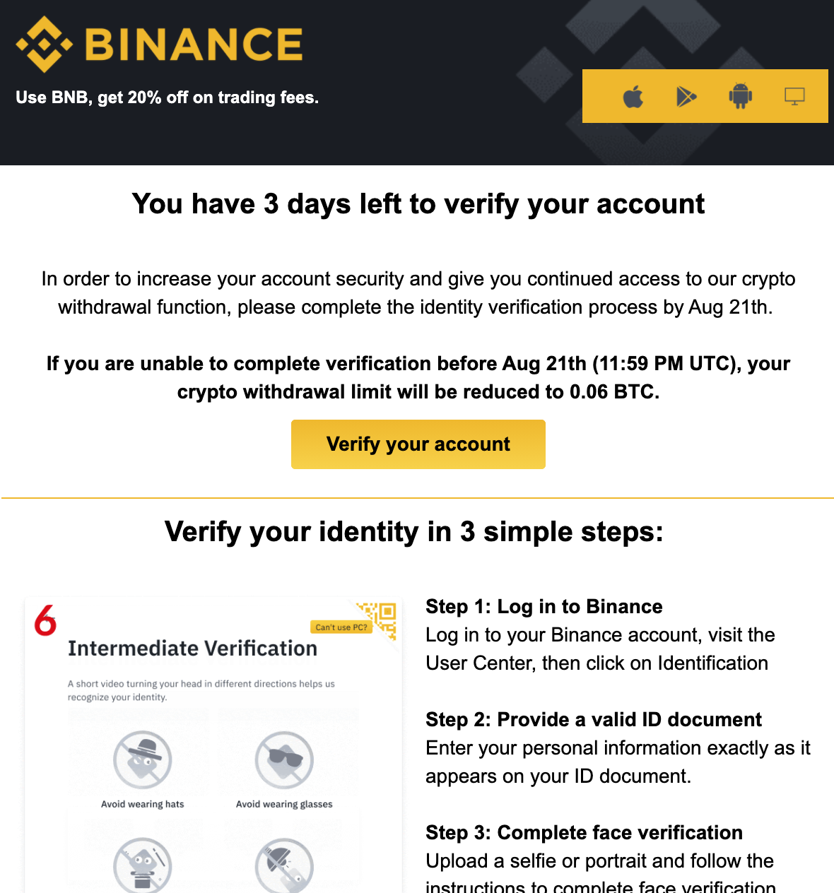 Un día antes del comunicado oficial los usuarios de Binance fueron notificados por email de que disponían de tres días para realizar el KYC de nivel intermedio, pidiendo realizarlo antes del 21 de agosto. El comunicado estresaba que de no hacerlo el límite de retiro diario descendería a 0,6 BTC. En ningún momento se mencionó la razón para este cambio.