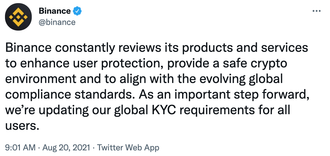 Anteriormente, todos los usuarios debían de cumplimentar una verificación básica, el cual constaba tan sólo del nombre y de la fecha de nacimiento. En la actualidad, según el anunciado todos los usuarios nuevos que accedan a Binance tendrán que realizar de manera obligatoria el KYC de nivel intermedio, el cual pide mostrar un documento de identidad y un reconocimiento facial.