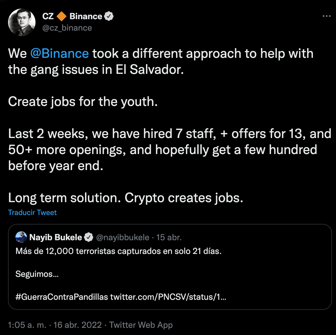 “Nosotros en Binance tomamos un enfoque diferente para ayudar con los problemas de pandillas en El Salvador. Crear puestos de trabajo para los jóvenes”