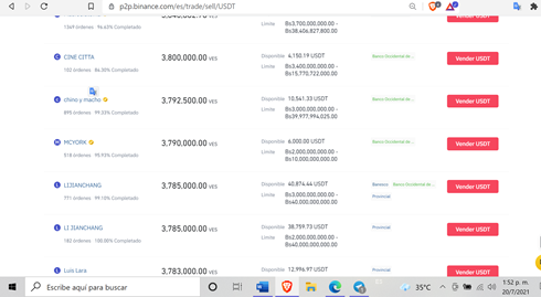 Mercado P2P para USDT en Venezuela 20/7/2021. Fuente: Binance