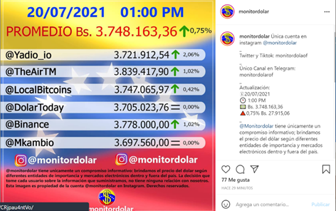 Si bien dentro del portal “Monitor Dolar Vzla”, que parece ser el que rige las tasas cambiarias del país, también existen diversos indicadores de otros fuertes competidores de Binance en Venezuela: LocalBitcoins y TheAirTm.