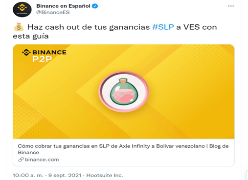 El anuncio, compartido el día de hoy en la cuenta Twitter de Binance, junto a un enlace a su blog oficial, ha sido titulado “Cómo cobrar tus ganancias en SLP de Axie Infinity a Bolívar venezolano”