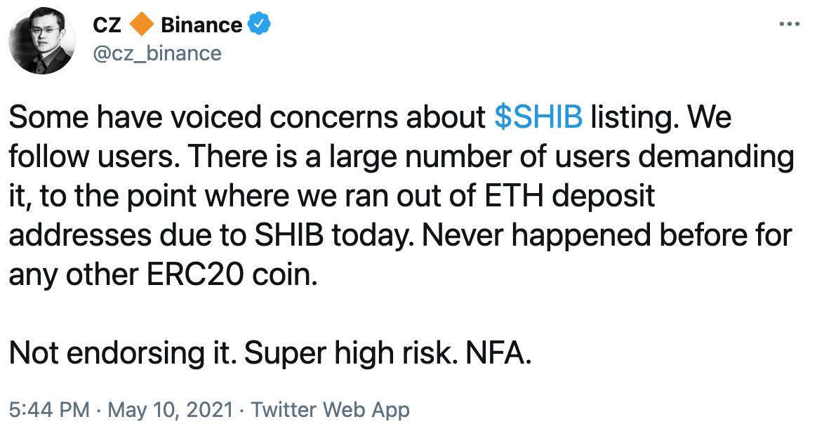Algunos han expresado su preocupación sobre el listado de SHIB. Nosotros seguimos a los usuarios. Hay una gran cantidad de usuarios que lo demandan, hasta el punto en que hoy nos quedamos sin direcciones de depósito de ETH debido a SHIB. Nunca antes había sucedido con ninguna otra moneda ERC20.