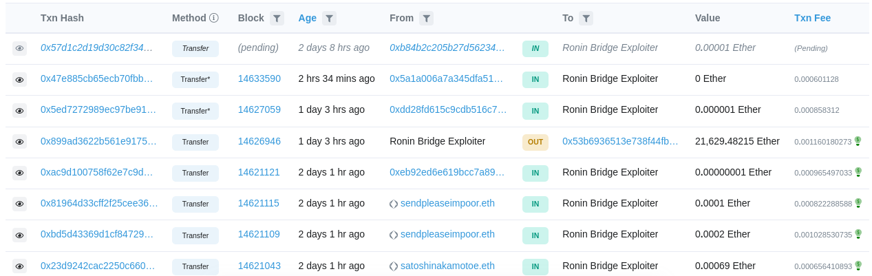 Al momento de la publicación, el monedero con la etiqueta Ronin Bridge Exploiter tiene un saldo de 94,821 ETH o 285 millones de dólares. Es importante resaltar que, a mediados de abril, la dirección poseía 147,753.03 ETH.