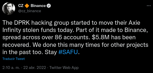 Sponsored“El grupo de hackers de la RPDC comenzó a mover sus fondos robados de Axie Infinity hoy. Parte de esto se hizo a Binance, repartido en más de 86 cuentas. Se han recuperado 5,8 millones de dólares. Hicimos esto muchas veces para otros proyectos en el pasado también”.
