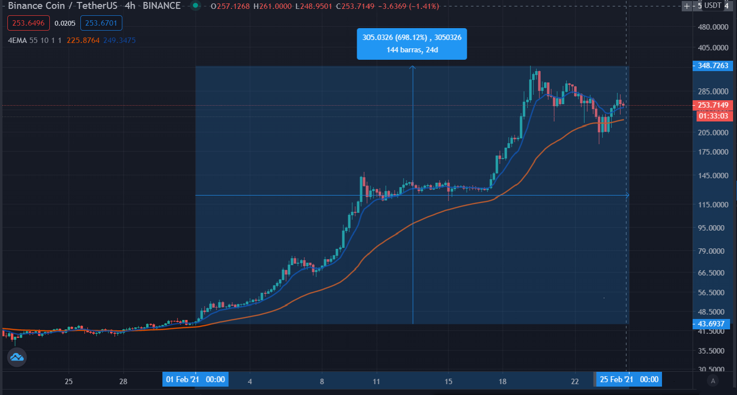 El 20 de febrero ETH (el token de Ethereum) alcanzó su máximo histórico de $2.036,29, mientras que BNB ya lo había conseguido el día anterior, rozando los $342.8, en una subida impresionante de casi un 700% durante el mes de febrero.