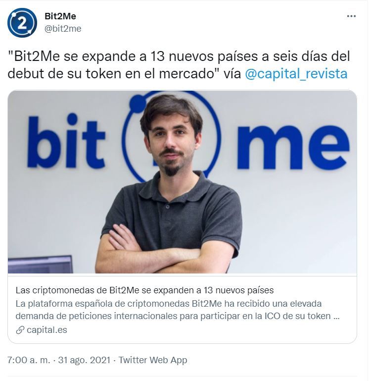 La empresa detalla que su operación ICO concluirá el próximo 30 de septiembre, cuando haya en circulación 1,250 millones de tokens. Recientemente, Bit2Me realizó una venta “piloto” donde logró recaudar brevemente más de 2,5 millones de euros.