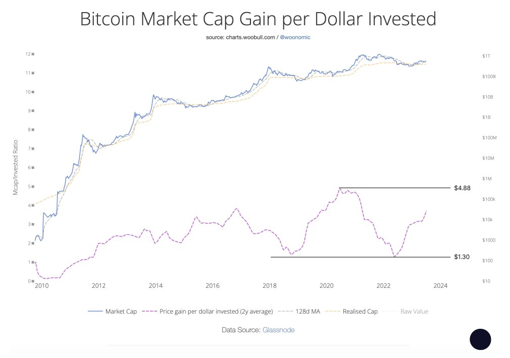 Willy Woo basa sus predicciones en la métrica “Bitcoin Market Cap Gain per Dollar Invested”, que es la relación entre el aumento del valor total de mercado y el aumento del valor total realizado (el último valor de cada Bitcoin cuando se movió por última vez en la blockchain) .