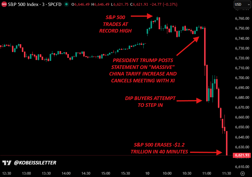El mercado cripto sufrió una fuerte caída este viernes tras las nuevas amenazas de Donald Trump de imponer aranceles “masivos” a las importaciones chinas y cancelar su próxima reunión con el presidente Xi Jinping. El anuncio desató una ola de ventas en activos de riesgo, provocando que el valor total del mercado cayera en más de 125 mil millones de dólares en cuestión de horas.