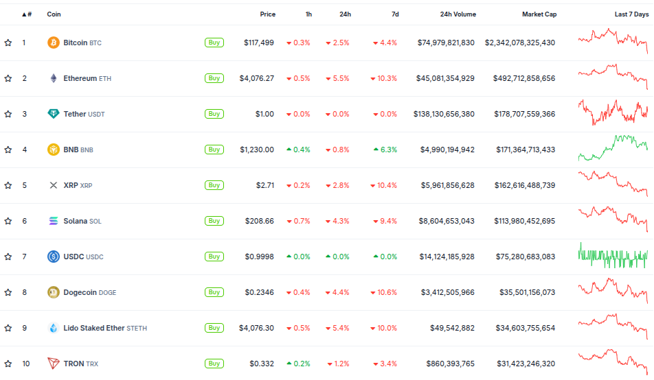 La capitalización total del mercado cripto cayó de alrededor de 4,27 billones de dólares a 4,10 billones de dólares, según CoinGecko. Bitcoin cayó 2.5% a 117,500 dólares, mientras que Ethereum bajó 5.5% a 4,076 dólares. Las altcoins enfrentaron pérdidas mayores, con Solana y XRP cayendo más del 2% respectivamente.