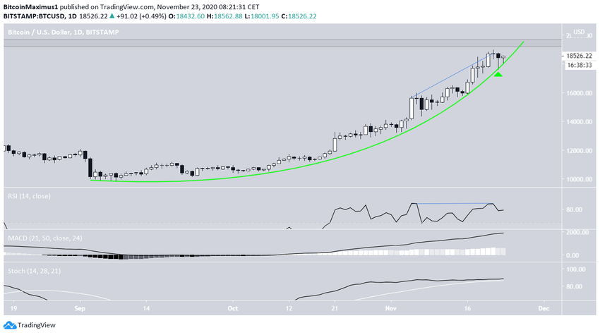 El marco temporal diario muestra que el BTC ha estado siguiendo una línea de apoyo ascendente parabólica desde septiembre.