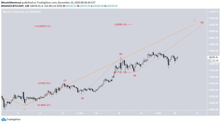 El recuento de ondas más probable para el BTC sugiere que el precio está en la quinta y última subonda menor (roja) de la quinta subonda (naranja) de un impulso alcista a largo plazo que comenzó en marzo.