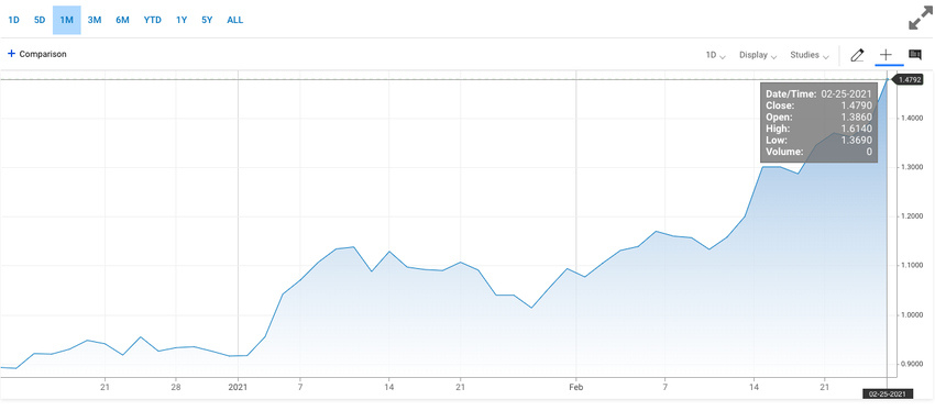 En las últimas dos semanas, el rendimiento de los bonos del Tesoro de EE. UU., a 10 años ha aumentado 48 puntos básicos en comparación con el 1,13% registrado el 10 de febrero. El 25 de febrero, superó brevemente el 1,6%, que es el nivel más alto en un año.