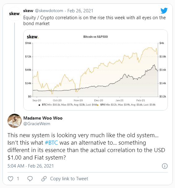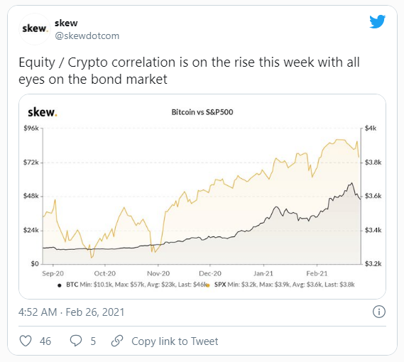 El gráfico de skew muestra que la correlación entre Bitcoin (BTC) y las acciones sigue aumentando a medida que los bonos continúan cayendo.