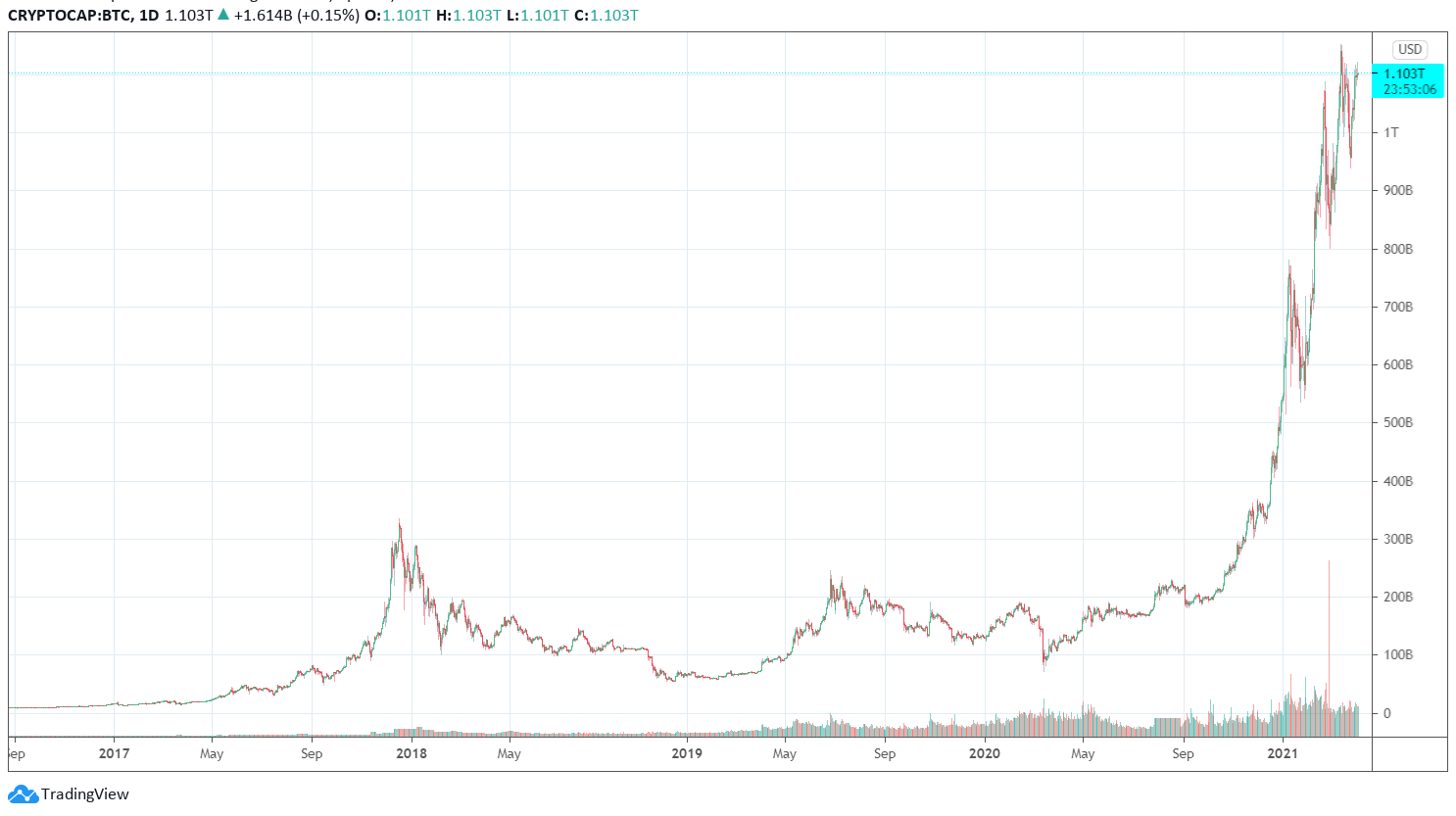 Actualmente Bitcoin cuenta con una capitalización de mercado superior a 1 billón de dólares gracias a la entrada de empresas financieras como Grayscale, Microstrategy, Square, MassMutual y Tesla, entre otras.