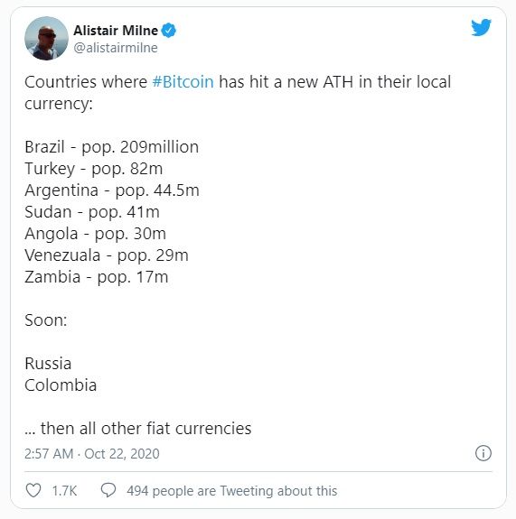 Para algunos de estos países, el máximo histórico de diciembre de 2017 se había eliminado antes del pump de BTC registrado el miércoles. En el real brasileño, por ejemplo, el BTC alcanzó por primera vez un máximo histórico en agosto de 2020. En la lira turca, un nuevo máximo llegó a finales de julio.