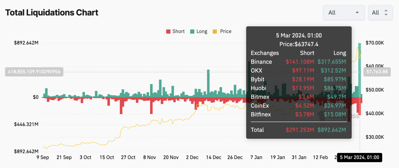 Esta brusca caída, atribuida a la liquidación de posiciones largas apalancadas, se tradujo en más de 1,000 millones de dólares en posiciones liquidadas, con unos 296,908 traders afectados. Esto supuso aproximadamente 892 millones de dólares en posiciones largas y unos 291 millones de dólares en posiciones cortas, según datos de CoinGlass.