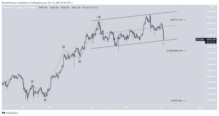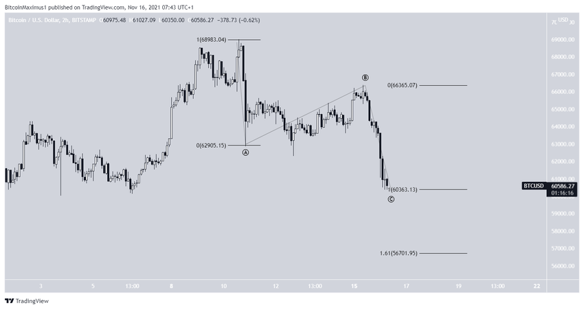 Si la caída a corto plazo es una estructura A-B-C, entonces las ondas A:C ya tendrían una proporción de 1:1. Una proporción de 1:1,61, que es la segunda más común, llevaría a BTC a 56,700 dólares.
