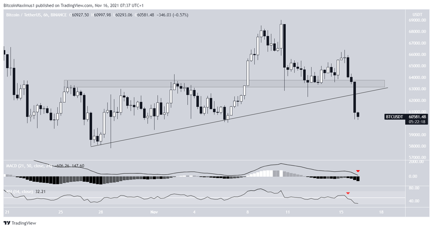 El gráfico de seis horas es igualmente bajista. Muestra que BTC sufrió una ruptura tanto desde el área de soporte de 63,500 dólares como desde una línea de soporte ascendente que había estado en su lugar desde el 26 de octubre.