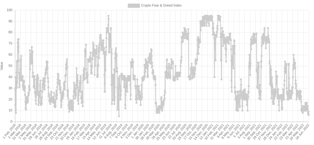 Por otra parte, el Índice de Miedo y Codicia marca actualmente un valor de 6, su segundo nivel más bajo desde agosto de 2018, cuando alcanzó un valor de 5. Este valor indica que el mercado cripto experimenta un sentimiento de miedo extremo.