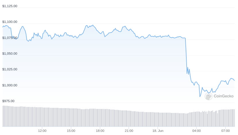 Ethereum, la segunda criptomoneda más grande por capitalización de mercado también ha recibido un golpe contundente. En las últimas horas, el precio de ETH cayó por debajo de los 1,000 dólares.