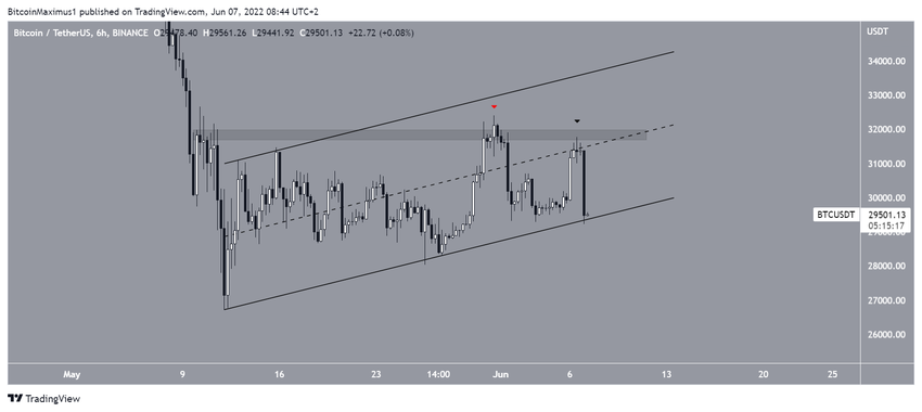 El gráfico de seis horas muestra que BTC ha estado aumentando dentro de un canal paralelo ascendente desde el 12 de mayo. Dichos canales generalmente contienen estructuras correctivas, lo que significa que se esperaría una eventual ruptura de los mismos.
