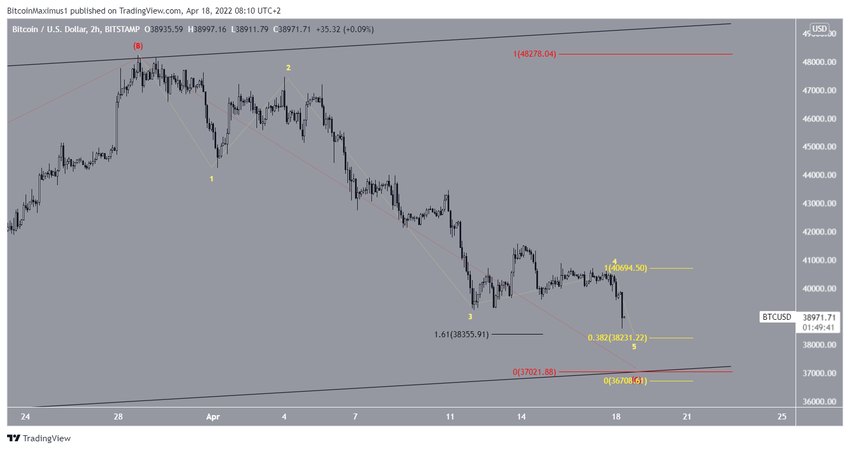 SponsoredEl recuento de ondas a corto plazo sugiere que BTC está en la quinta y última onda y sugiere un objetivo principal de 38,200 dólares para tocar fondo. Esto se encuentra utilizando el retroceso externo de Fib de 1.61 de la onda cuatro (negro) y la longitud de la onda uno (amarillo).