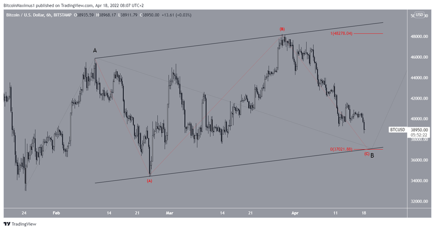 El recuento de ondas sugiere que BTC está completando una estructura correctiva A-B-C (roja), lo que podría llevar a un mínimo de 37,000 dólares. Esto daría a las ondas A y C una proporción de 1:1. Esto también permitiría a BTC volver a probar la línea de soporte de un gran canal paralelo ascendente.