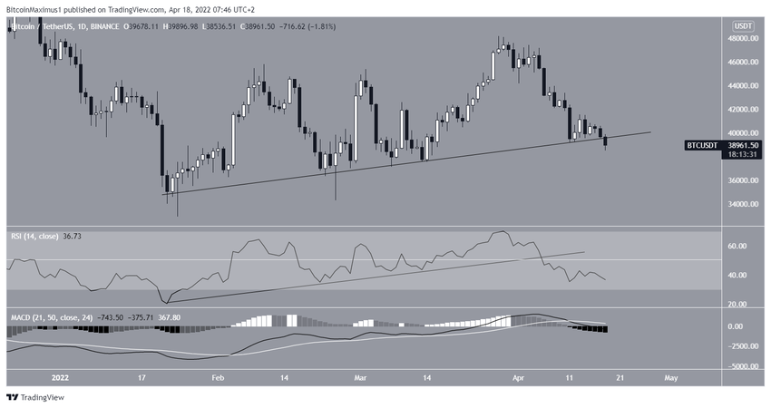 Además de esto, BTC ha caído por debajo de una línea de soporte ascendente que había estado vigente desde el 14 de enero, pero aún no ha alcanzado un cierre diario por debajo de esta línea.