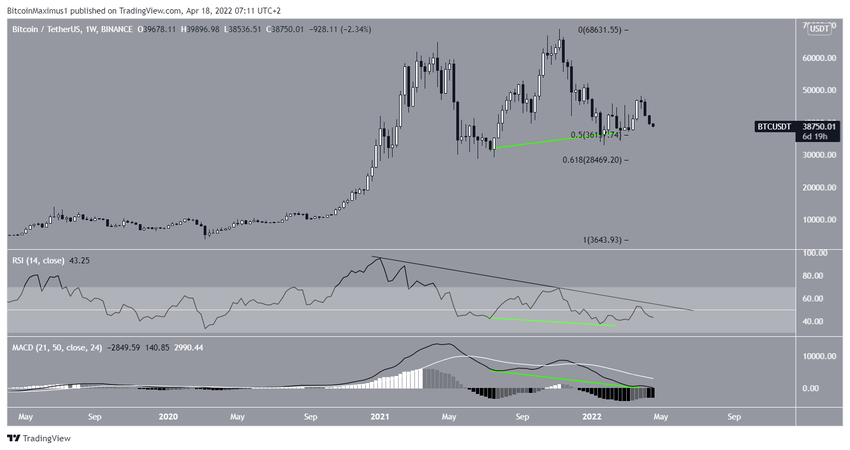 A pesar de que la acción del precio parece bajista, BTC todavía cotiza por encima del nivel de soporte de retroceso de 0.5 Fib de 36,100 dólares.