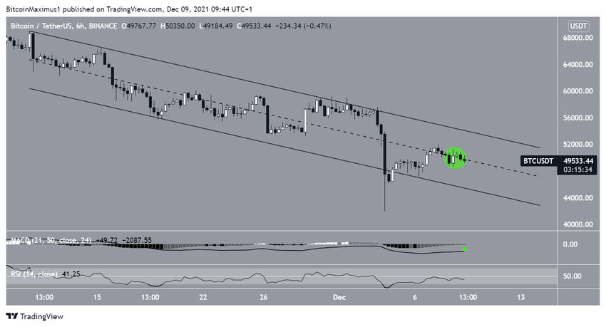 El gráfico de seis horas muestra que BTC se cotiza dentro de un canal paralelo descendente desde el precio máximo histórico del 10 de noviembre.