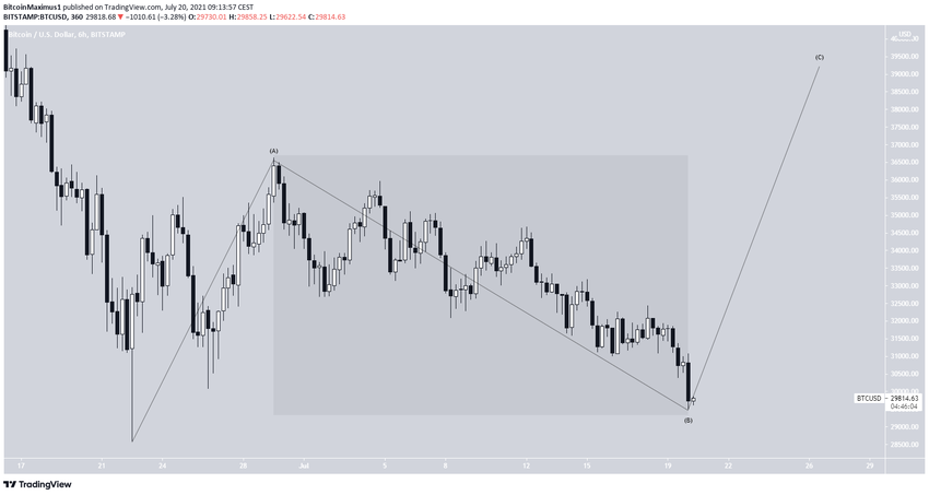 El recuento de ondas indica que BTC se encuentra en una estructura correctiva plana. El movimiento a la baja desde el 28 de junio es extremadamente entrecortado y gradual, por lo que es poco probable que sea un impulso bajista.