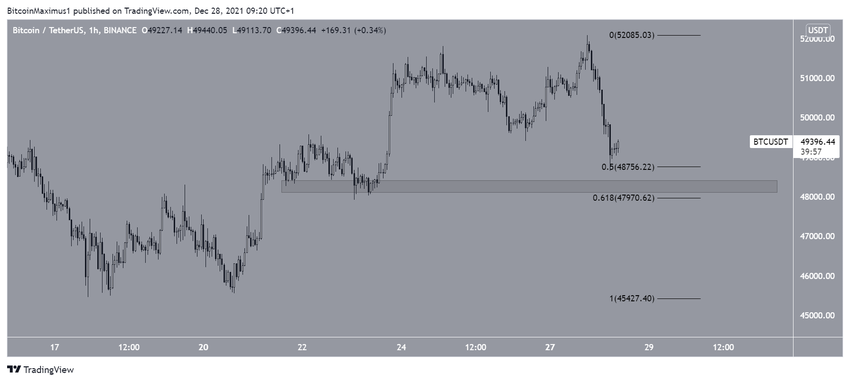 Una mirada al gráfico horario muestra que hay soporte entre 48,000 dólares y 48,750 dólares. El soporte es creado por los niveles de soporte de retroceso de Fibonacci de 0.5-0.618 al medir la porción más reciente del movimiento ascendente.