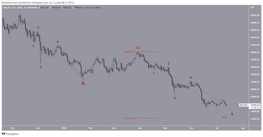 El recuento de ondas a largo plazo sugiere que BTC está en la onda C de una estructura correctiva A-B-C (roja) que se ha estado desarrollando desde que se alcanzó el máximo histórico de $ 69,000 en noviembre de 2021.