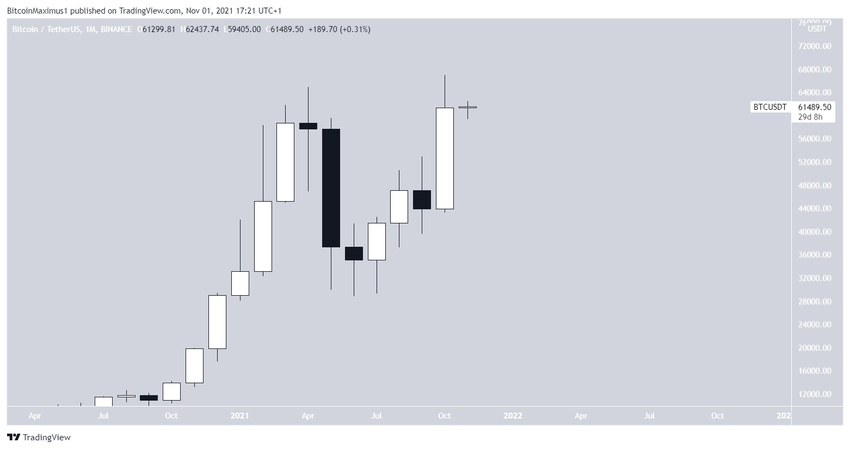 Además de su nuevo máximo histórico, Bitcoin (BTC) alcanzó su cierre mensual en 61,299 dólares por primera vez en su historia.