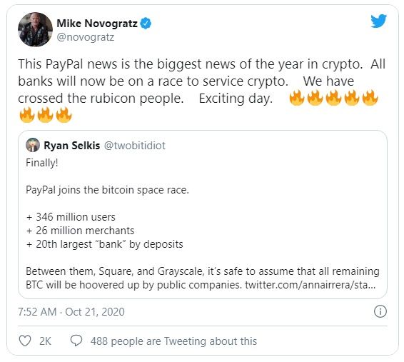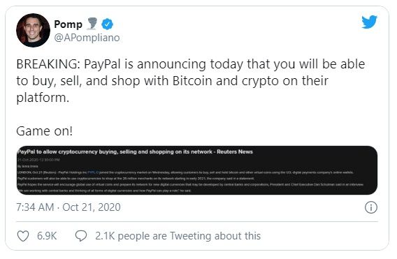 En un comunicado publicado el 21 de octubre, el gigante de los pagos reveló que permitirá los pagos con criptomonedas en su red a principios de 2021.