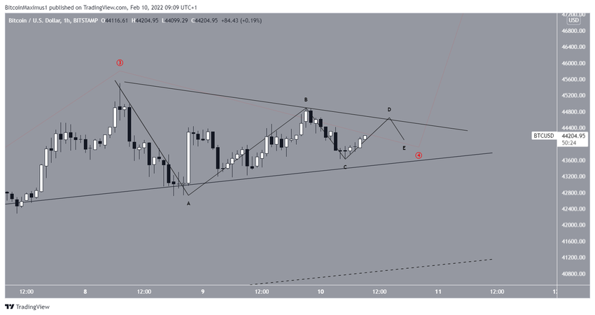 La segunda posibilidad indica que BTC está completando un triángulo de cuarta onda. En este patrón, en lugar de retroceder a la línea media del canal, el precio continuaría consolidándose por encima de su línea de resistencia y eventualmente subiría desde allí.