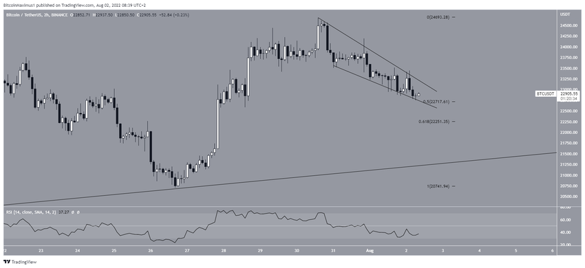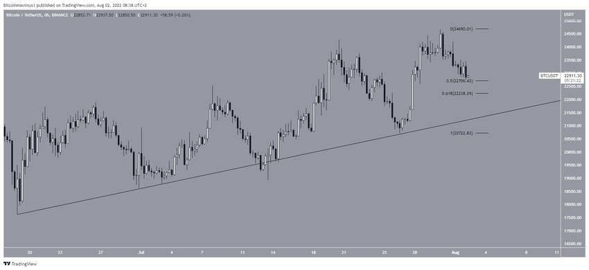 El gráfico de seis horas muestra que BTC aún podría estar siguiendo una línea de soporte ascendente que se creó a mediados de junio. La línea actualmente se cruza cerca de 21,800 dólares, alineándose con el área de soporte horizontal delineada anteriormente.