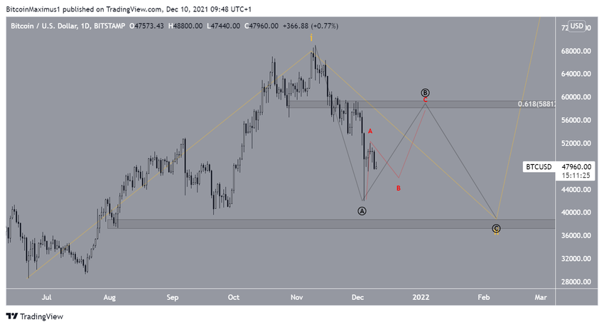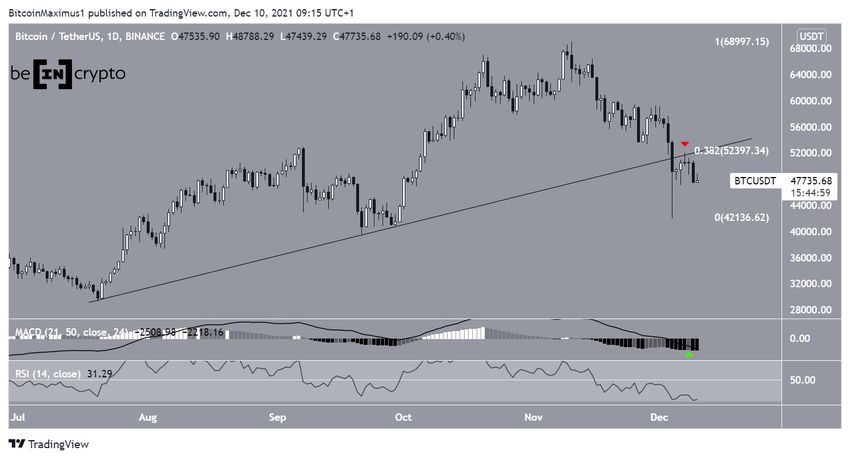Bitcoin ha estado cayendo desde el 7 de diciembre, cuando alcanzó un máximo de 51,936 dólares (icono rojo). El máximo se hizo muy cerca del nivel de resistencia de retroceso de Fibonacci de 0.382 en 52,400 dólares. Además, validó la línea de soporte ascendente anterior desde la que BTC rompió el 4 de diciembre como resistencia.
