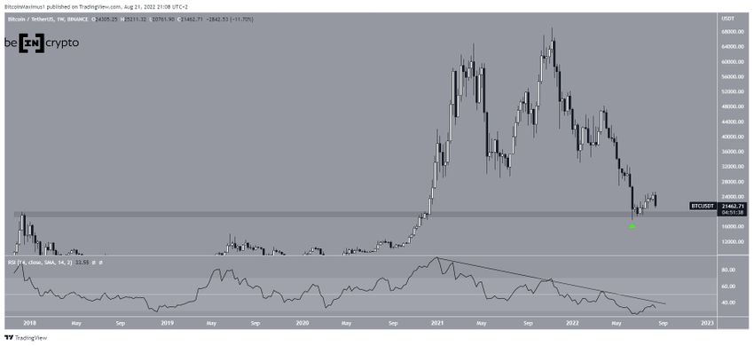 Bitcoin ha estado cayendo desde que alcanzó un precio máximo histórico de 69,000 dólares en noviembre de 2021. Hasta ahora, el movimiento a la baja ha llevado a un mínimo local de 17,622 dólares que se registró en junio de 2022.